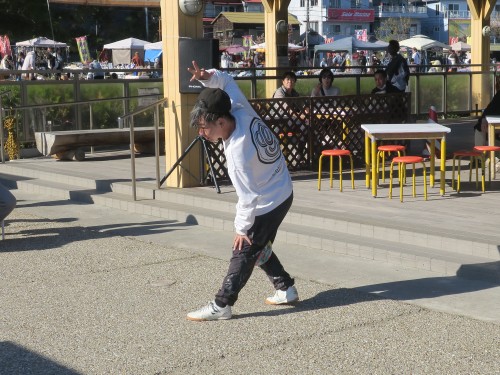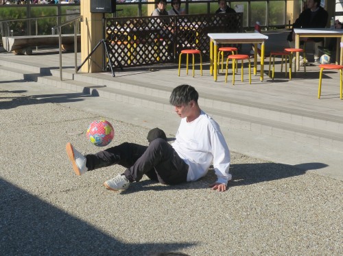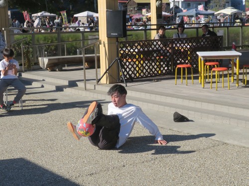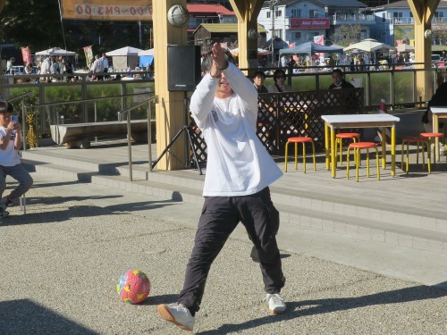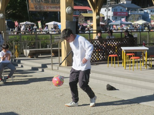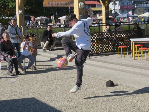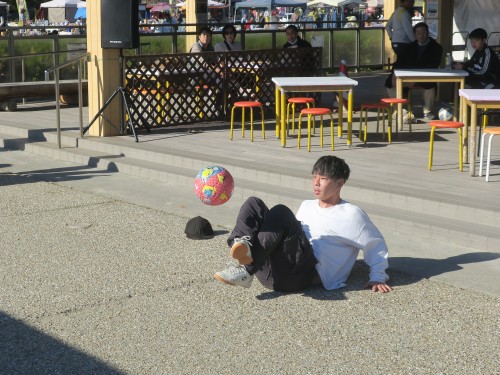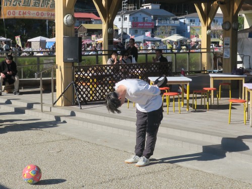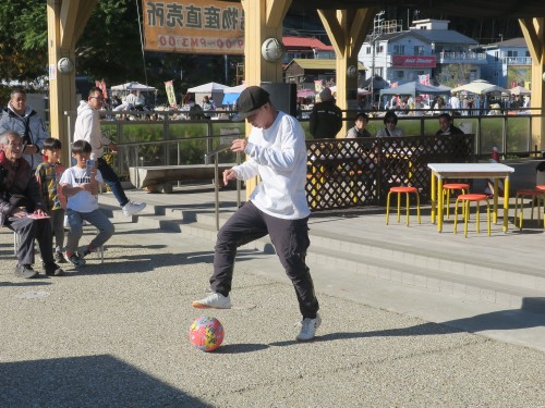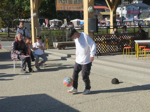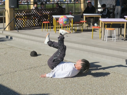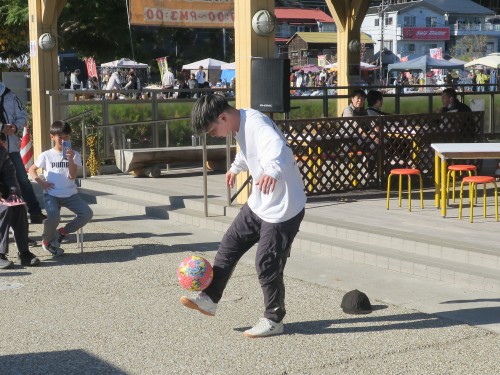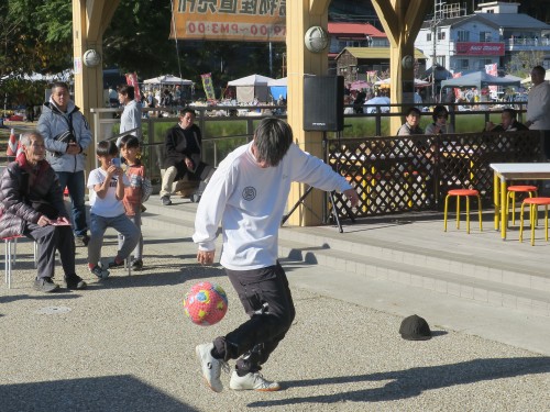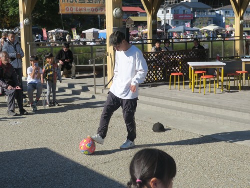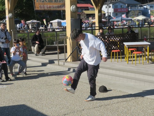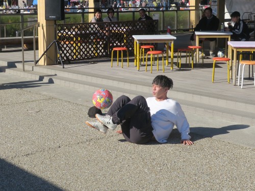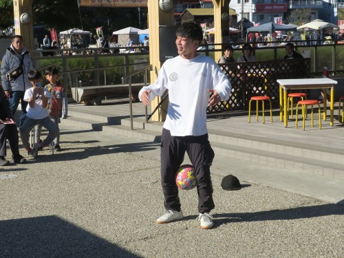 フリースタイルフットボールの事、技の紹介、目指す所などをマイク・パフォーマンスで紹介。