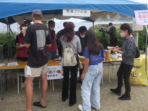 10時頃から「猪汁」の無料試食がはじまり、1時間余りで400食が完配しました。