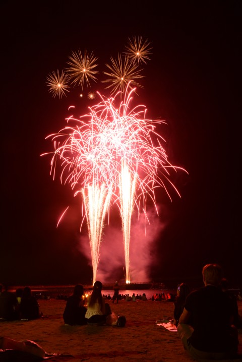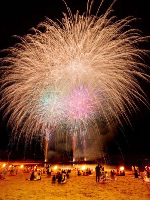 多賀湾の夏の夜空を焦がす海上花火大会。色とりどりの大輪の花が咲き誇り、伊豆多賀温泉の夏を盛り上げます。フィナーレは赤いナイヤガラです。