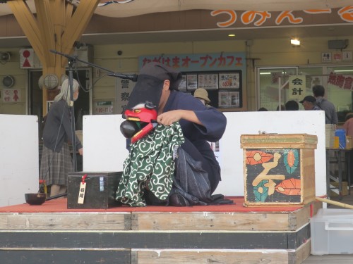 膝にヒョットコの面を付け、軽妙な仕種を見てもらうもの。キセルが宙に舞うとか、瓢箪からお酒を飲み、顔が一瞬で赤くなるというストーリーですが、何回見ても面白い芸です。